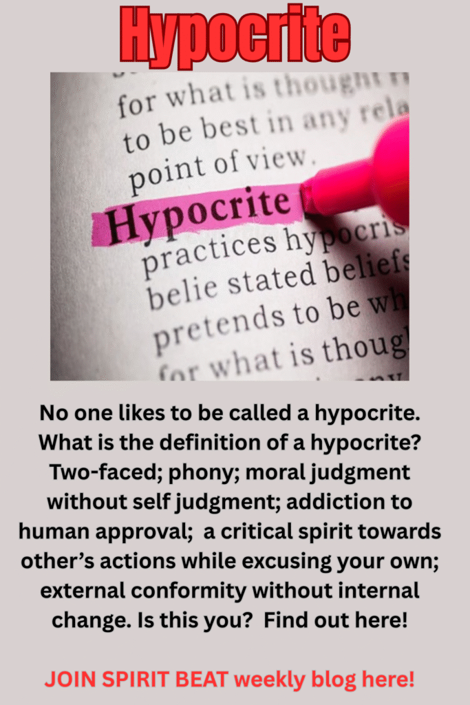 No one likes to be called a hypocrite. What is the definition of a hypocrite? Two-faced. A phony. Moral judgement without self judgement. Addiction to human approval. A critical spirit towards other’s actions while excusing your own. External conformity without internal change.